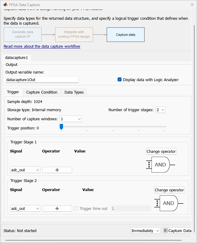 To start data capture, click Capture Data. Data capture object requests one buffer of captured data from the FPGA. The default setting is to capture immediately, without waiting for a trigger condition.