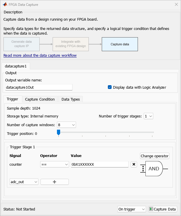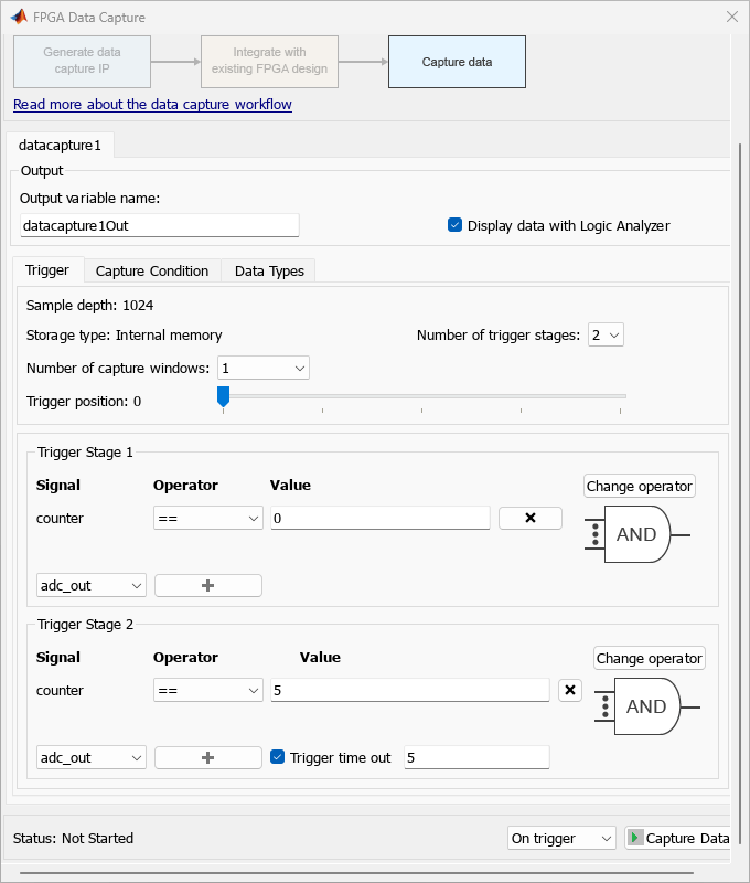 To capture data from the FPGA around a particular event, you can configure trigger conditions in the FPGA Data Capture tool. For example, to capture the audio data only after a counter reaches a certain value.