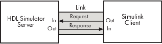 When linked with MATLAB, the HDL simulator functions as the client, as the following figure shows.
