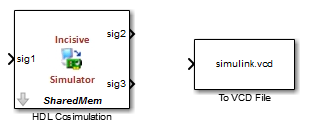 In the Simulink Library Browser, click HDL Verifier and then select the block library for your HDL simulator. You will see the HDL Cosimulation block icon and the To VCD File block icon.
