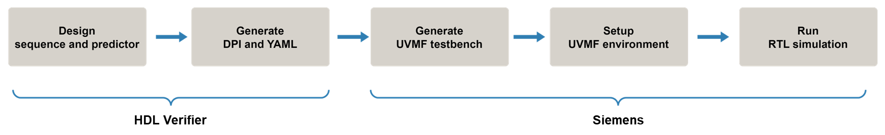 This example shows how to generate DPI components for a UVM sequence and predictor, and integrate them into a UVM framework (UVMF) testbench for block-level verification. The workflow follows these steps: