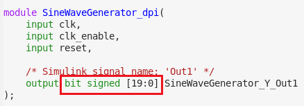 This Simulink model generates a discrete sine wave using a signed fixed-point data type containing 20 bits. By default the generated SystemVerilog code uses 'int' data type to represent this port. This example shows how to generate SystemVerilog code that uses bit or logic vectors to represent the exact length of the fixed-point number.