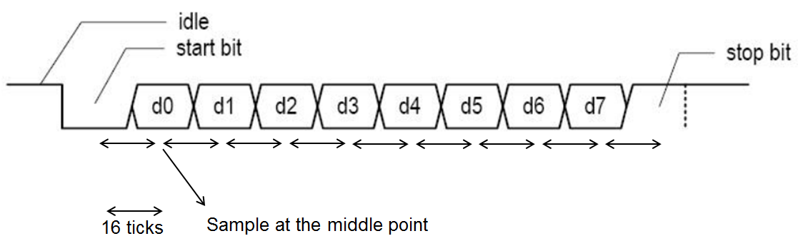 An oversampling scheme will be used to estimate the middle point of the data bit at a rate 16 times the baud rate, as shown in the figure below.