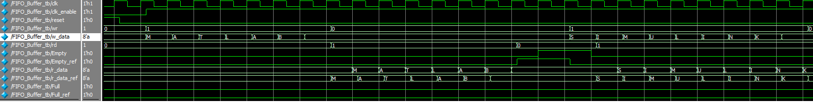 In the testbench 6 ASCII letters ('MATLAB') are transferred via the serial 'rx' signal, and written into the FIFO buffer. After the 6th letter transfer is complete the 'rd' signal is asserted to get the letters ('MATLAB') back in 'r_data'.
