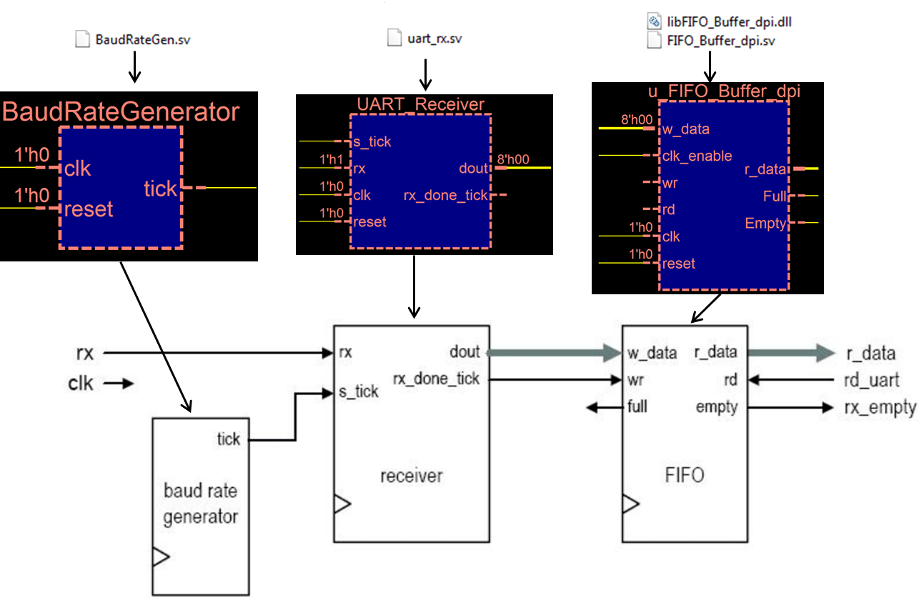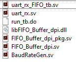 After the DPI component behavior has been verified, it is time to integrate it into the UART receiver. The following figure shows the files required for the different components.
