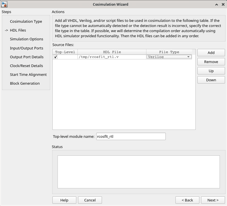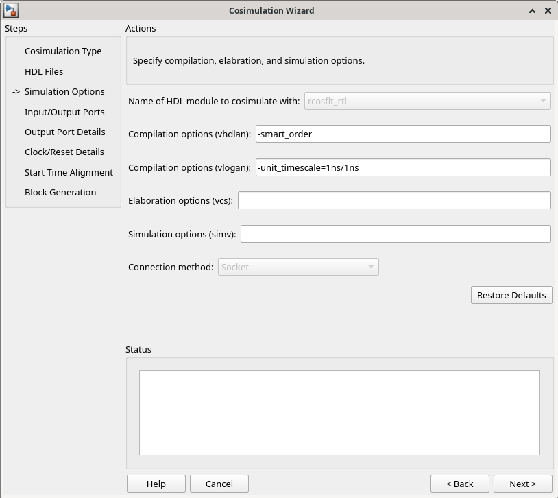 rcosflt_rtl. This module is the Verilog/VHDL module you use for cosimulation. If you do not seercosflt_rtlin the drop-down list, you can enter the file name manually.For Connection method, select