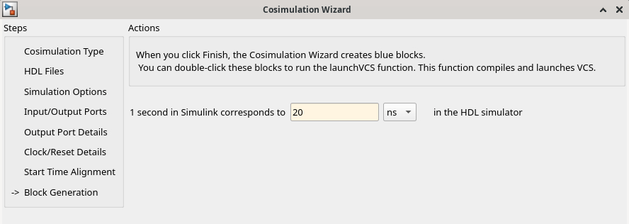 Before you generate the HDL Cosimulation block, you have the option to determine the timescale before you finish the Cosimulation Wizard. Alternately, you can instruct HDL Verifier to calculate a timescale later. Timescale calculation by the verification software occurs after you connect all the input/output ports of the generated HDL Cosimulation block and start simulation.
