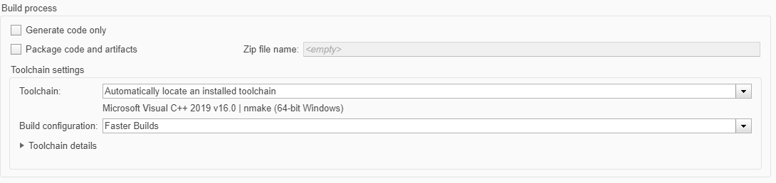 In the Toolchain settings section, select one of the Visual Studio versions if you are using Windows or one of the GCC toolchains if you are using Linux.