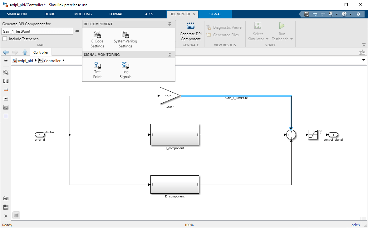 1. In the svdpi_pid Simulink model, select the Controller Subsystem block. In the Generate section on the toolstrip, click Generate DPI Component.