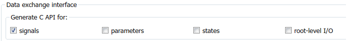 Enable C API options. In the Configuration Parameters dialog box, on the Code Generation > Interface tab, select signals.
