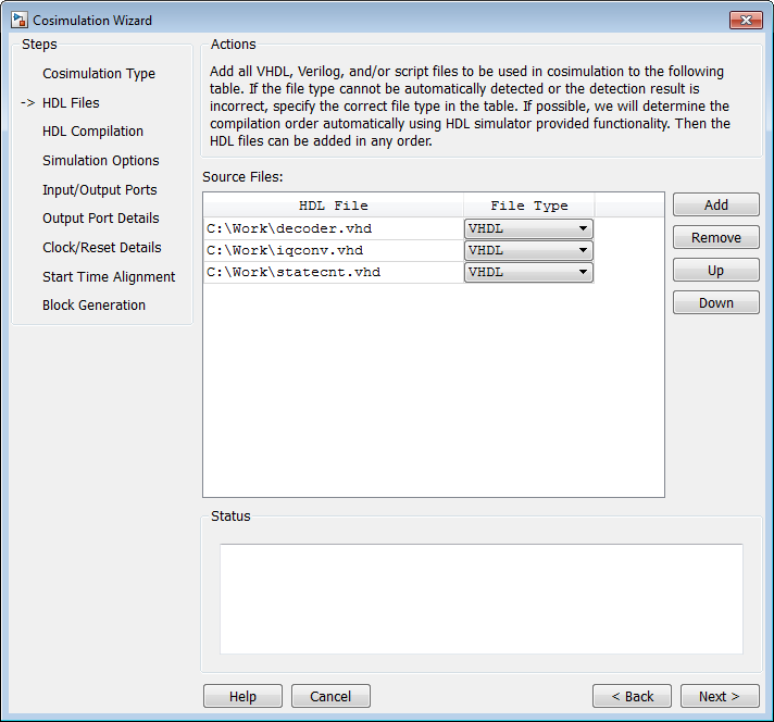 The Cosimulation Wizard attempts to determine the file type of each file and display the type in the File List next to the file name. If the Cosimulation Wizard cannot determine the type or displays the wrong type, you can change the type directly in the File Type column.
