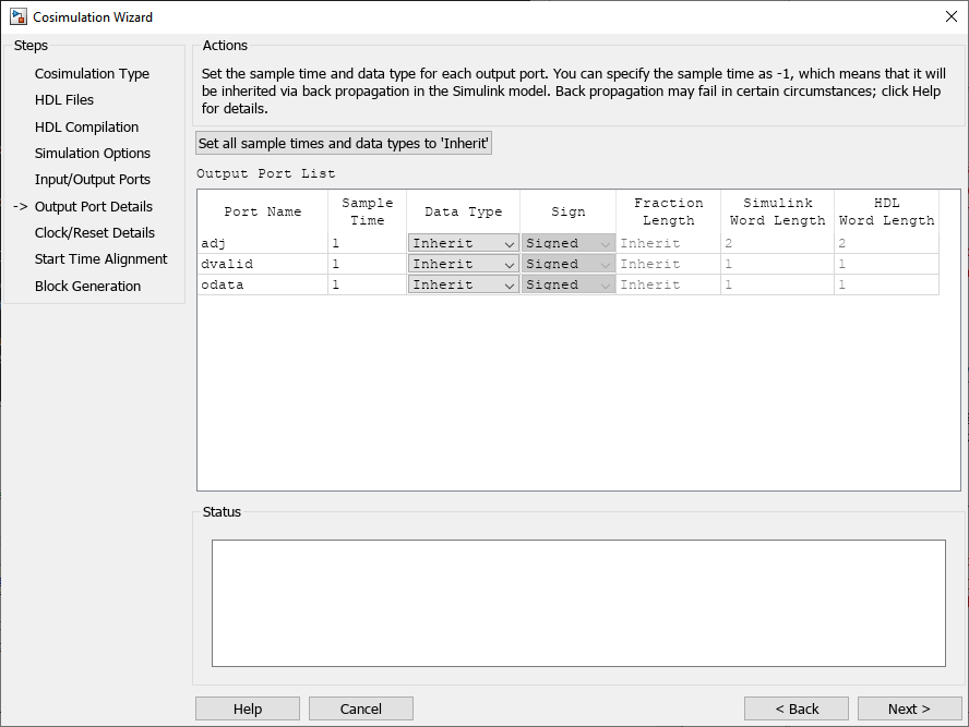 1, the data type default isInheritandSigned. These defaults are consistent with the way the HDL Cosimulation block mask (Ports tab) sets default settings for output ports.If you select Set all sample times and data types to 'Inherit', the ports inherit the times via back propagation (sample times are set to -1). However, back propagation may fail in some circumstances; see Backpropagation in Sample Times (Simulink).