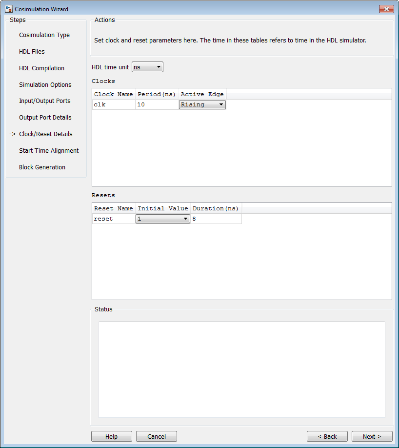 OutputorUnused.Simulink® forces clock and reset signals in the HDL simulator through Tcl commands. You can specify clock and reset signal timing in a later step (see Clock/Reset Details—Simulink Block).