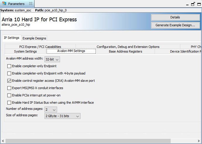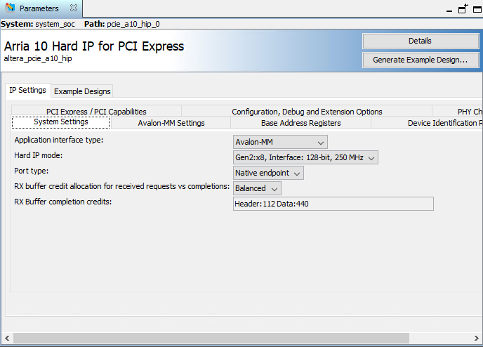 After instantiating the PCIe core HDL IP in your Quartus Qsys project, configure the PCIe core using these steps (this example is for an Arria® 10 board).