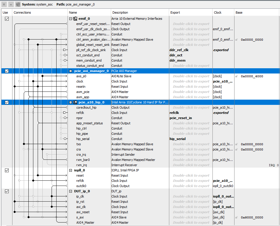 Connect the PCIe AXI Manager IP to the PCIe core (this example shows Arria 10 Hard IP for PCI Express).