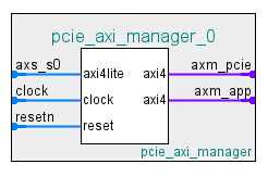 clockandresetnare the clock and reset inputs. Connect them to the AXI clock and reset.axs_sois a 32-bit subordinate interface and is used for accessing the PCIe configuration registers. Connect this interface to the Avalon Memory Mapped master interface.axm_pcieis a 128-bit AXI manager interface. Connect this interface to the TX subordinate port on the PCIe core.axm_appis a 128-bit AXI manager interface. Connect this interface to your application logic.