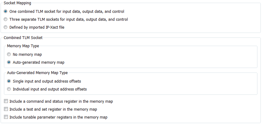 One combined TLM socket for input data, output data, and control — Selecting this option displays the Combined TLM Socket parameters to configure the generated memory map. See Memory Map Configuration.