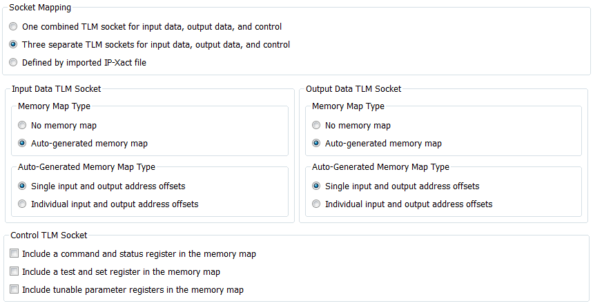 Three separate TLM sockets for input data, output data, and control — Selecting this option displays separate memory map parameters for the three sockets. See Memory Map Configuration.