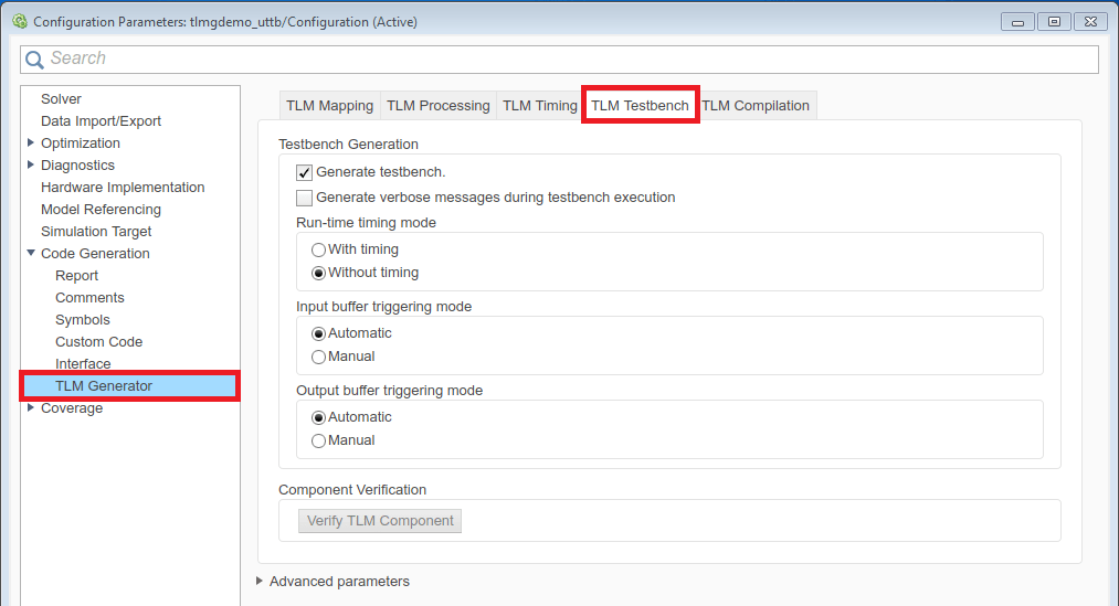 In the Configuration Parameters dialog box, go in TLM Testbench configuration parameter dialog and push the Verify TLM Component button to run the generated testbench in the untimed timing mode or in the MATLAB command window execute: