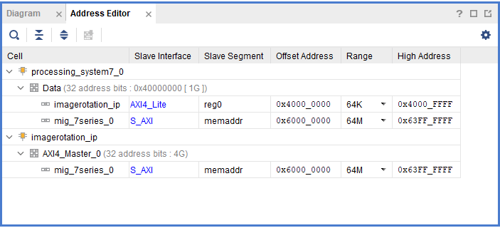 Open the Address Editor window to view the address mapping of the mig_7series_0 (memory controller) and imagerotation_ip IPs.