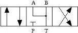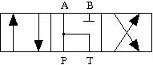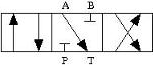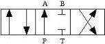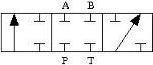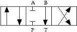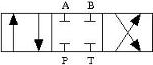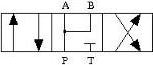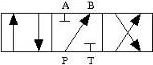 In the default configuration, one valve position corresponds to the P-A and B-T flow paths maximally open and the P-B and A-T flow paths maximally closed (position I in the figure). Another valve position corresponds to the inverse configuration, with P-B and A-T maximally open and P-A and B-T maximally closed (position II). The third valve position corresponds to all flow paths maximally closed (position III). A translating spool serves as the valve control member and determines the position that the valve is in—I, II, III, or in between.