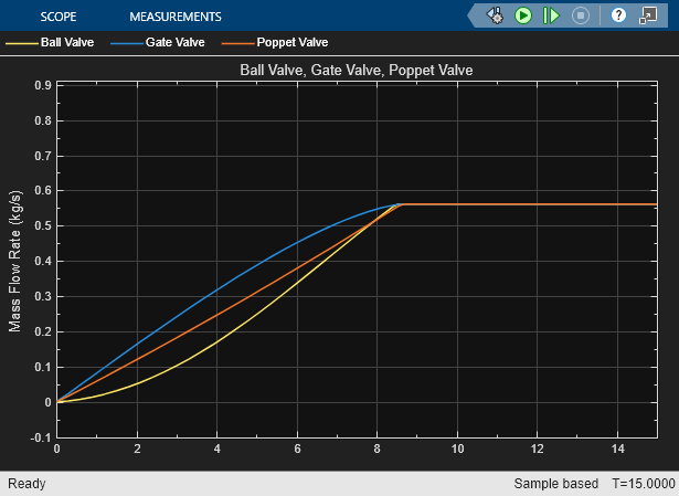 The block calculates flow through the valve using the pressure-area relationship for orifices such that