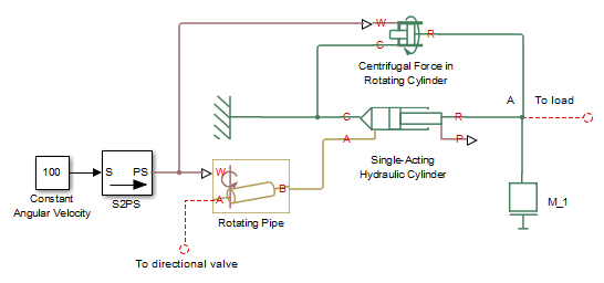 The following schematic diagram shows a model of a custom single-acting hydraulic cylinder built of the Single-Acting Hydraulic Cylinder, Rotating Pipe, and Centrifugal Force in Rotating Cylinder blocks.