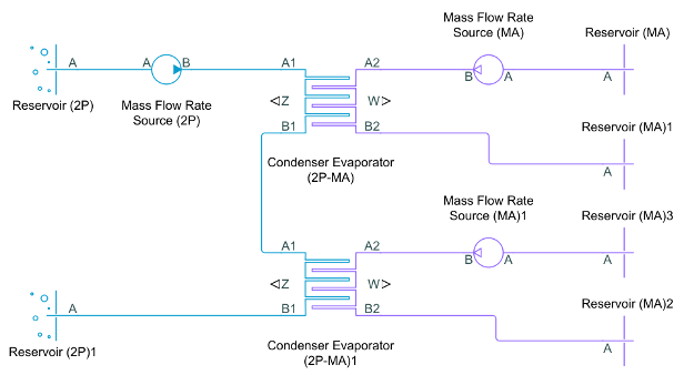 For example, to achieve a two-pass configuration on the two-phase fluid side and a single-pass configuration on the moist air side, you can connect the two-phase fluid sides in series and the moist air sides to the same input in parallel (such as two Mass Flow Rate Source blocks with half of the total mass flow rate), as shown below.