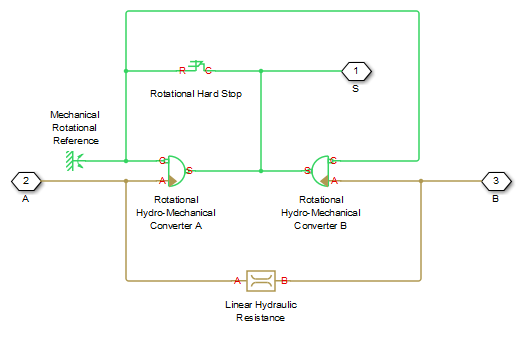 Connections A and B are hydraulic conserving ports. Port A is connected to chamber A and port B is connected to chamber B. Connection S is a mechanical rotational conserving port associated with the actuator shaft.