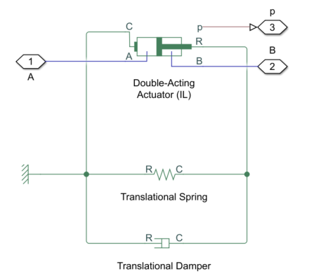 The Double-Acting Servo Actuator block comprises an Isothermal Liquid library block and two Simscape Foundation blocks: