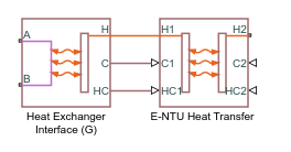 The Heat Exchanger (G) block models heat exchange between a gas, which flows between ports A1 and B1, and an external, controlled fluid via a physical signal.