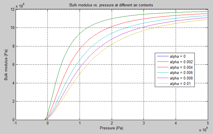 The main objective of representing fluid as a mixture of liquid and gas is to introduce an approximate model of cavitation, which takes place in a chamber if pressure drops below fluid vapor saturation level. As it is seen in the graph below, the bulk modulus of a mixture decreases at , thus considerably slowing down further pressure change. At high pressure, , a small amount of nondissolved gas has practically no effect on the system behavior.