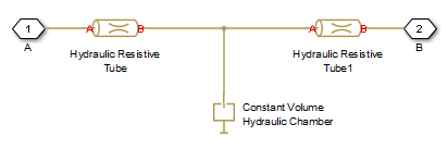 The Hydraulic Resistive Tube blocks account for friction losses, while the Constant Volume Hydraulic Chamber block accounts for fluid compressibility. By using the block parameters, you can set the model to simulate pipeline with rigid or flexible walls, including simulation of hydraulic hoses with elastic and viscoelastic properties.
