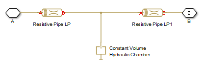 The Resistive Pipe LP blocks account for friction losses, while the Constant Volume Hydraulic Chamber block accounts for fluid compressibility. To reduce model complexity, you can use this block to simulate not only a pipe itself, but also a combination of pipes and local resistances such as bends, fittings, inlet and outlet losses, associated with the pipe. You must convert the resistances into their equivalent lengths, and then sum up all the resistances to obtain their aggregate length. Then add this length to the pipe geometrical length. By using the block parameters, you can set the model to simulate pipeline with rigid or flexible walls, including simulation of hydraulic hoses with elastic and viscoelastic properties.