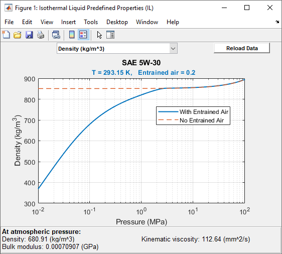 To visualize the fluid density and bulk modulus in your network, right-click the Isothermal Liquid Predefined Properties (IL) block and select Fluids > Plot Fluid Properties.