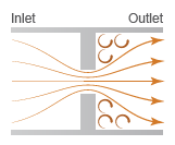 This mass balance implies that there is an increase in velocity when there is a decrease in area, and there is a reduction in velocity when the flow discharges into a larger area. In accordance with the Bernoulli principle, this change in velocity results in a region of lower pressure in the orifice and a higher pressure in the expansion zone. The resulting increase in pressure, which is called pressure recovery, depends on the discharge coefficient of the orifice and the ratio of the orifice and port areas.