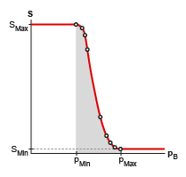 In the optional tabulated parameterization, the opening area is a general function of the outlet pressure, with its value dropping from a maximum (SMax) to a minimum (SMin) contained in the tabulated data. The maximum opening occurs at the minimum pressure (pMin) contained in the data and the minimum opening at the maximum pressure (pMax). Calculations are based on linear interpolation (between the tabulated bounds) and nearest-neighbor extrapolation (outside of those bounds).