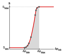 where SXY is a tabulated function constructed from the Pressure drop vector and Opening area vector block parameters. The function is based on linear interpolation (for points within the data range) and nearest-neighbor extrapolation (for points outside the data range). The leakage and maximum opening areas are the minimum and maximum values of the Valve opening area vector block parameter.