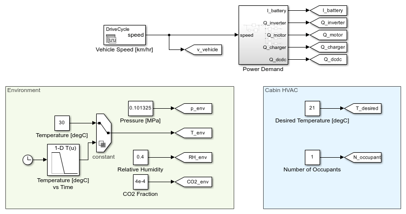 This subsystem sets up the environment conditions and inputs to the system for the selected scenario. The battery current demand and powertrain heat load are a function of the vehicle speed based on tabulated data.