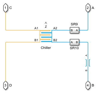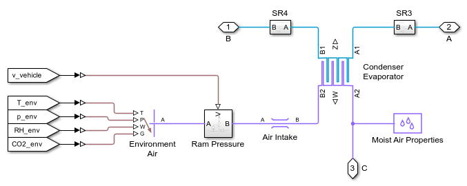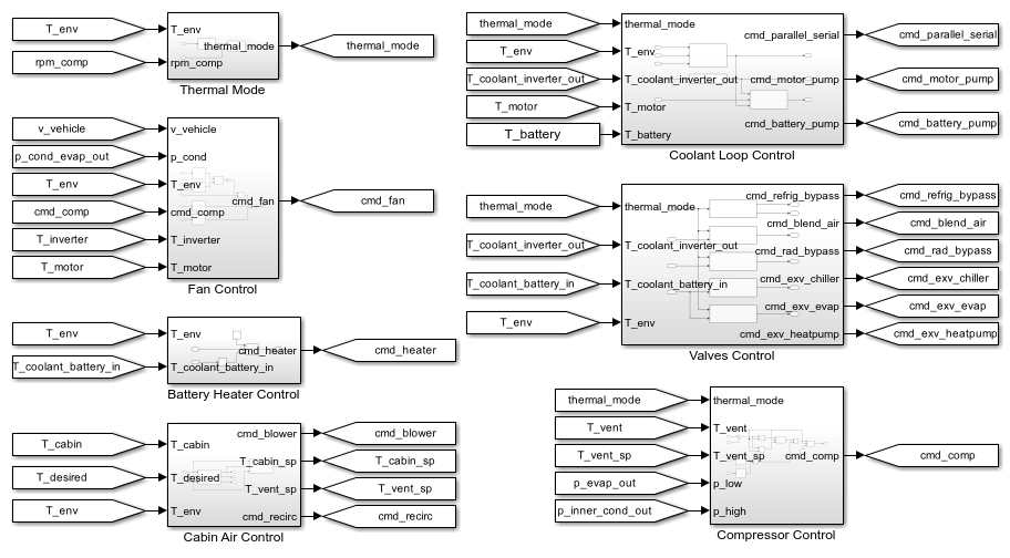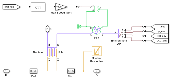 This example models the thermal management system of a battery electric vehicle (BEV) that includes a heat pump for cabin heating. The system consists of two liquid coolant loops, a refrigerant loop, and a cabin air HVAC loop. The thermal loads are the batteries, the powertrain, and the cabin.