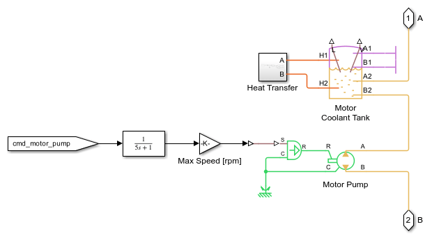 The motor, charger, inverter, and DCDC subsystems are the same. The motor is shown below. Each of the four subsystems models a coolant jacket around the motor, charger, inverter, or DC-DC converter, represented by a heat flow rate source and a thermal mass.