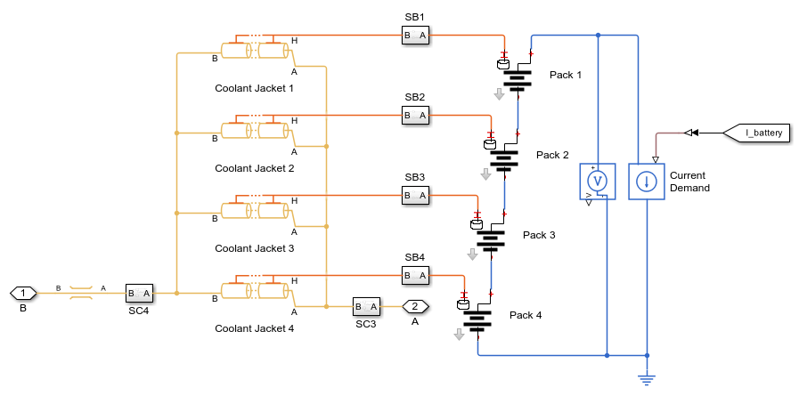 The batteries are modeled as four separate packs surrounded by a coolant jacket. The battery packs generate voltage and heat based on the current demand. The coolant is assumed to flow in narrow channels around the battery packs.