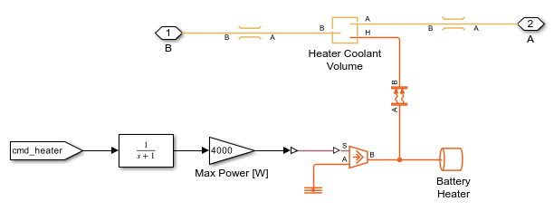 The battery heater model contains a heat flow rate source and a thermal mass. The battery heater turns on in cold weather to bring the battery temperature above 5 degC.