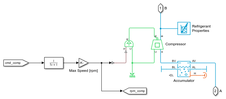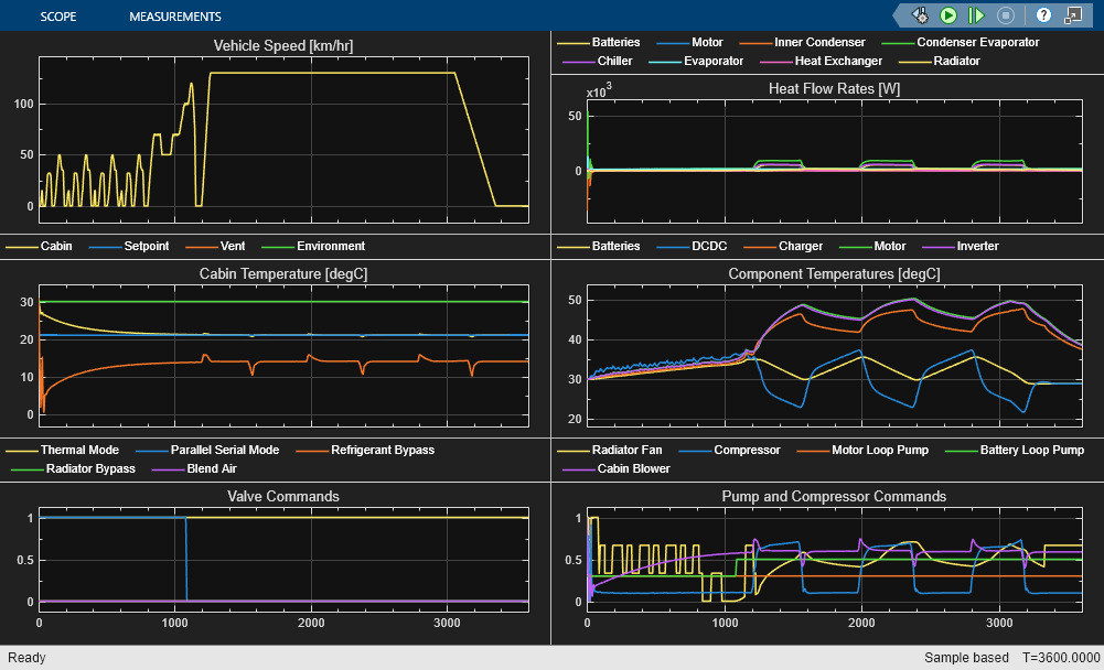 The following scope shows the vehicle speed, heat dissipation, cabin temperature, component temperatures, and control commands for the drive cycle scenario. At the beginning, the coolant loop is in serial mode. After about 1100 s, it switches to parallel mode and the chiller is used to keep the batteries below 35 degC. As the chiller expansion valve opens and closes to send refrigerant to the chiller, the compressor ramps up and down, respectively, to adjust to the thermal load of the batteries.
