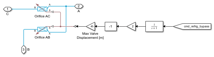 In cold loop mode, this 3-way valve, modeled as two orifices operating in the opposite manner, directs refrigerant to the chiller and expansion valve to cool the batteries and cabin. In heat pump mode, this 3-way valve directs refrigerant to the heat exchanger, bypassing the chiller and the evaporator.