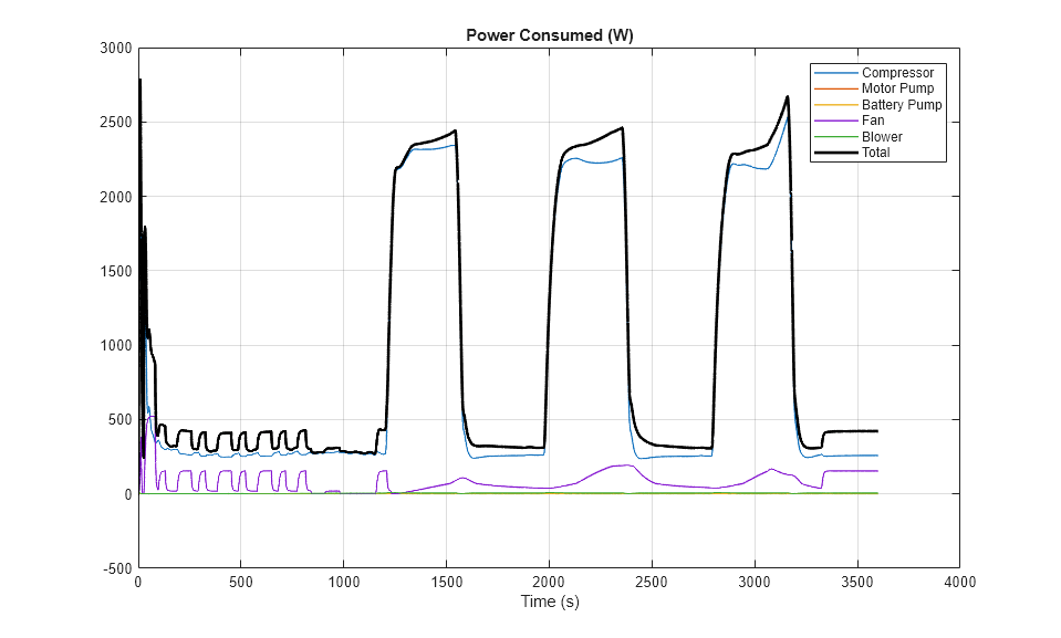 This plot shows the power consumed by the thermal management system to cool the vehicle components and cabin. The largest power consumption occurs in the refrigerant compressor when the chiller expansion valve opens to allow the chiller to cool the batteries.