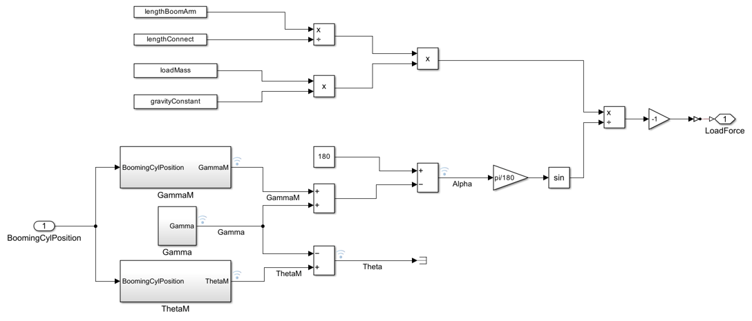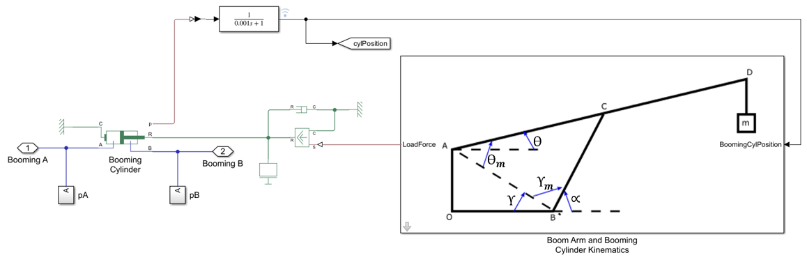Boom Arm and Booming Cylinder Kinematics Subsystem: This subsystem demonstrates how to compute the link angles relative to one another and the force applied by the boom arm on the booming cylinder rod.