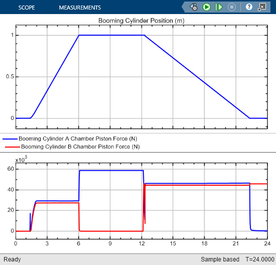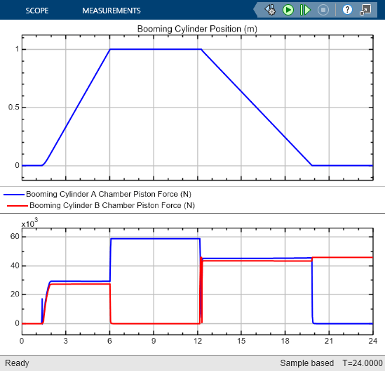This example shows how to model, parameterize, test, and compare design cases for a counterbalance valve in a boom arm mechanism. A counterbalance valve allows an upstream flow from the back port to the load port through the check valve stage during cylinder rod extension, and it allows a downstream flow from the load port to the back port through the relief valve stage during cylinder rod retraction in the boom arm mechanism. Counterbalance valves help with the load holding, load actuation, speed control, and safety by controlling the piston motion of the booming cylinder. When you run the model, it generates a plot of the booming cylinder position and the forces at the A side and B side of the cylinder piston.