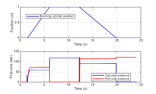 This figure shows the booming cylinder position and the pressures at the A side and B side of the cylinder piston.