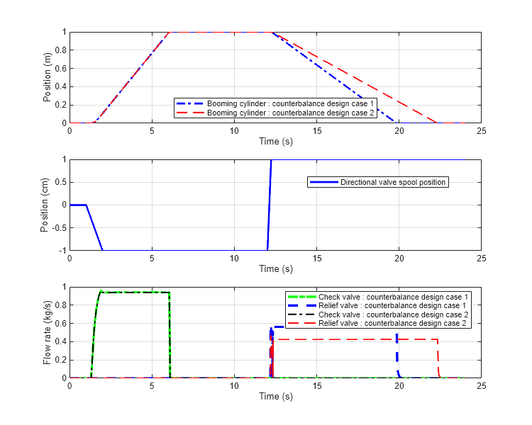 This figure shows the booming cylinder position, directional control valve position, and the flow rates through the counterbalance valve for the design cases 1 and 2 of the counterbalance valve. The booming cylinder extends in the negative position of the direction control valve and retracts in the positive position of the direction control valve.